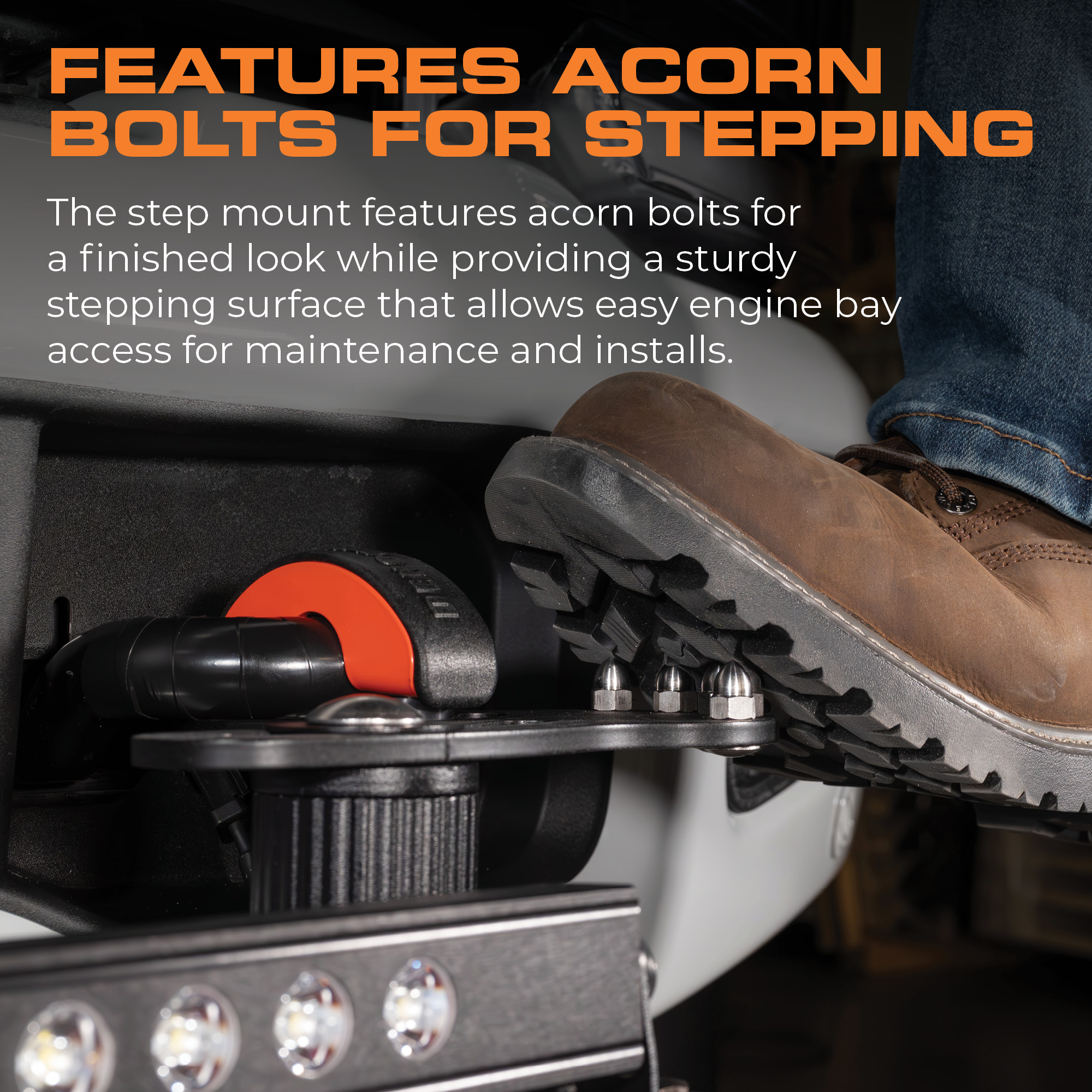 The optional step mount adds safety, accessibility, and utility. It doubles as a functional front step, allowing easier access to the engine bay, windshield, and roof rack. Acorn nuts provide traction, and the step is rated for up to 600 pounds, ensuring dependable strength. Built for harsh environments, Denominator is ideal as service truck light support, mining truck auxiliary visibility, and an overland expedition mounting solution. Whether outfitting a fleet vehicle, work truck, or adventure build, it delivers precise fitment, functional utility, and durable performance beyond illumination.