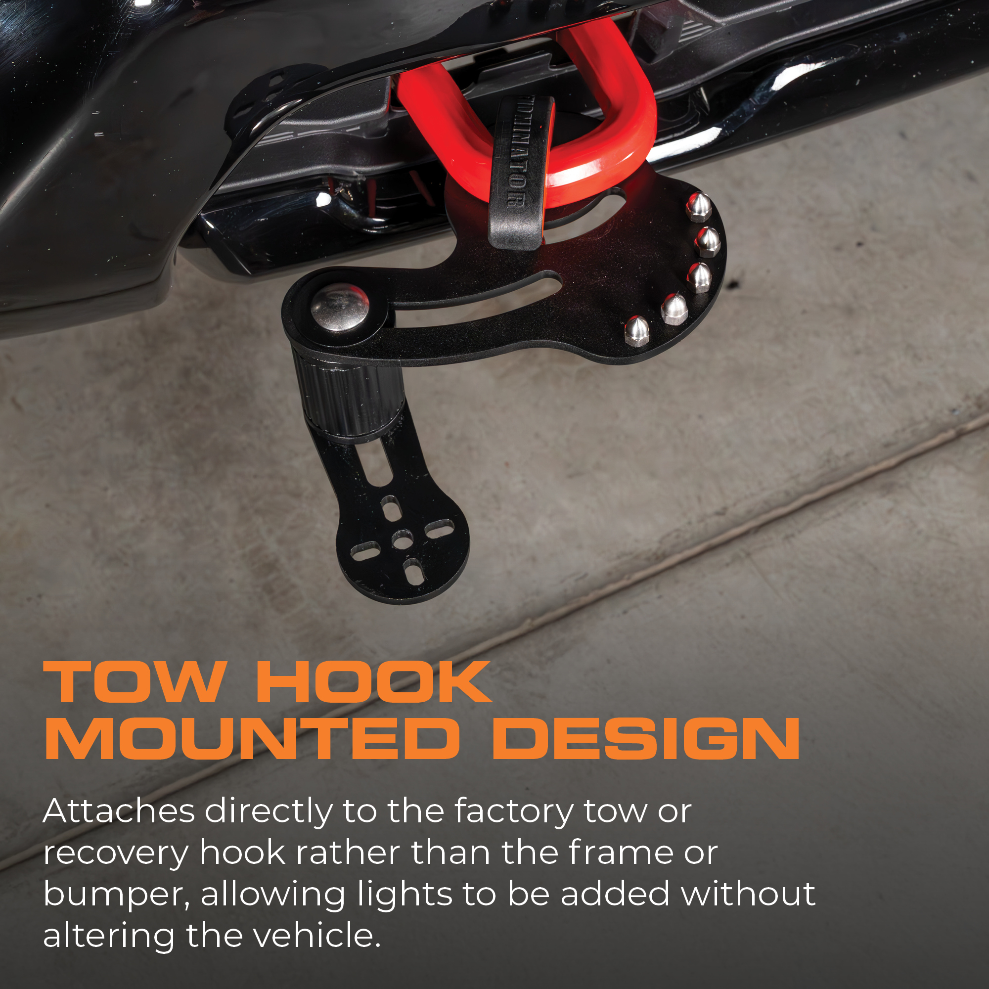 • Tow Hook Mounted Design: Attaches directly to the factory tow or recovery hook rather than the frame, allowing lights to be added without altering the vehicle.