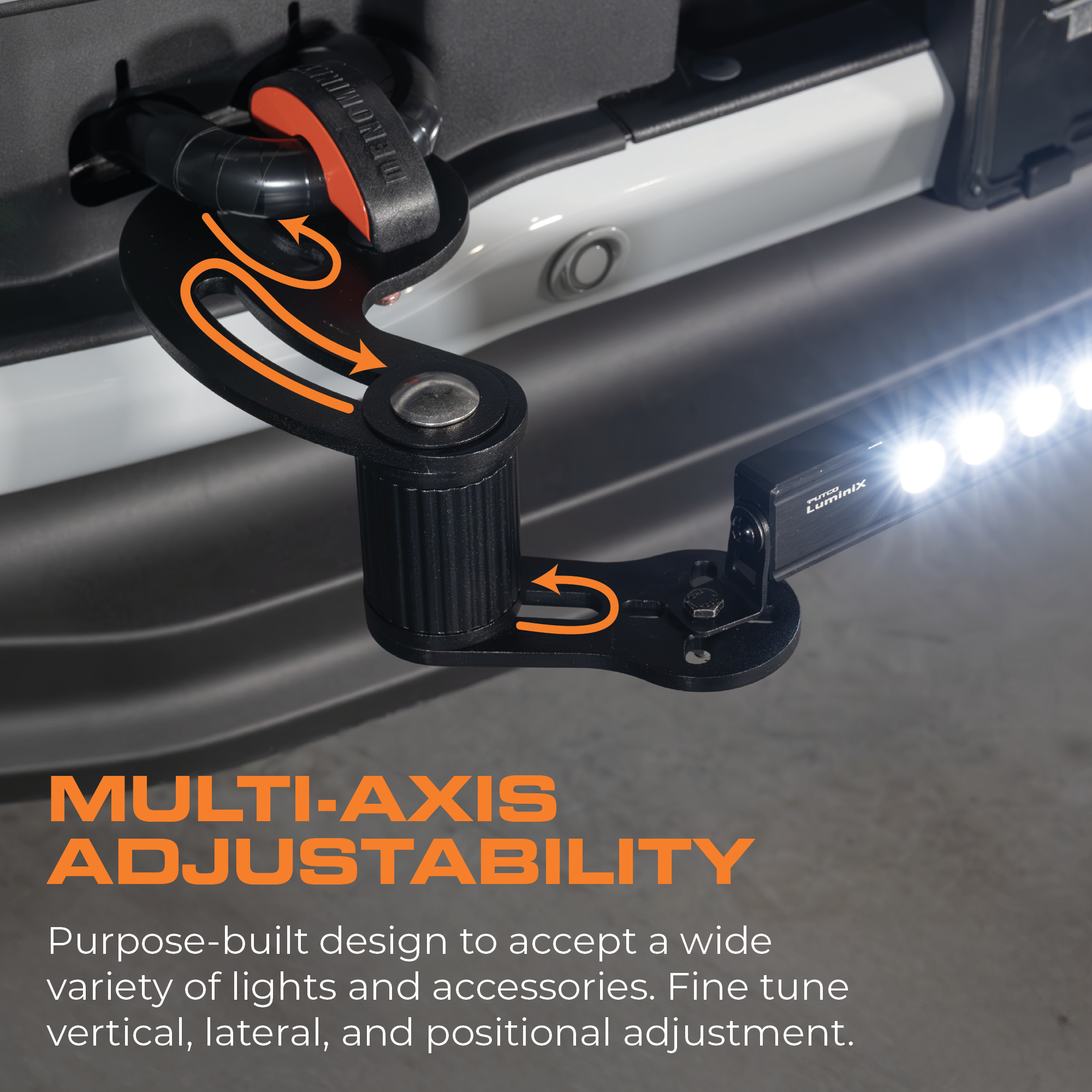 • Multi-Axis Adjustability: Purpose-built design to accept a wide variety of lights and accessories. Fine-tune vertical, lateral, and positional adjustment.
