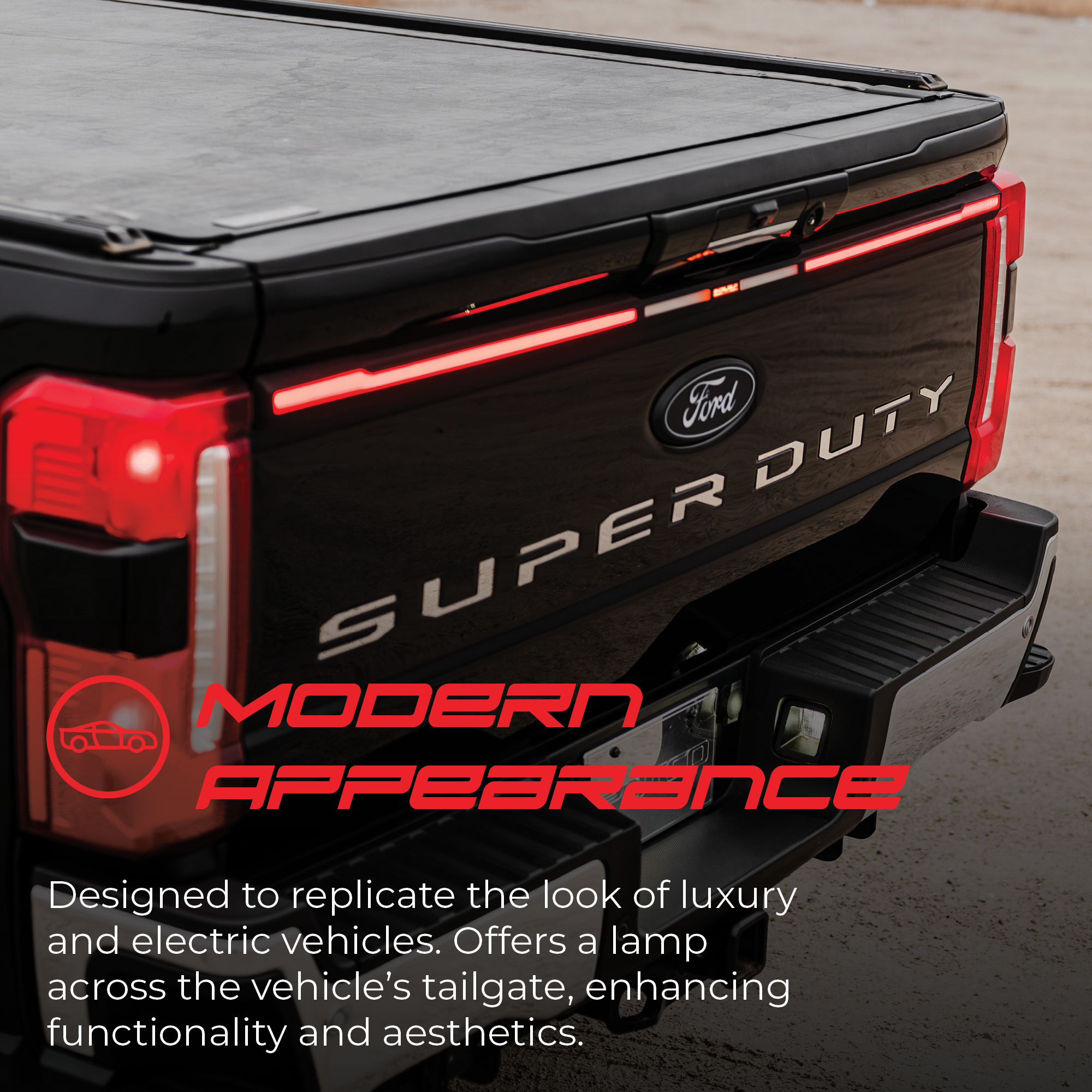 - Modern Appearance: Designed to replicate the “look” that is prevalent in luxury and electric vehicles, the Excalibur Third Tail Lamp is a direct-fit product that offers a comprehensive lamp across the width of the vehicle’s tailgate, simultaneously enhancing both functionality and aesthetics.