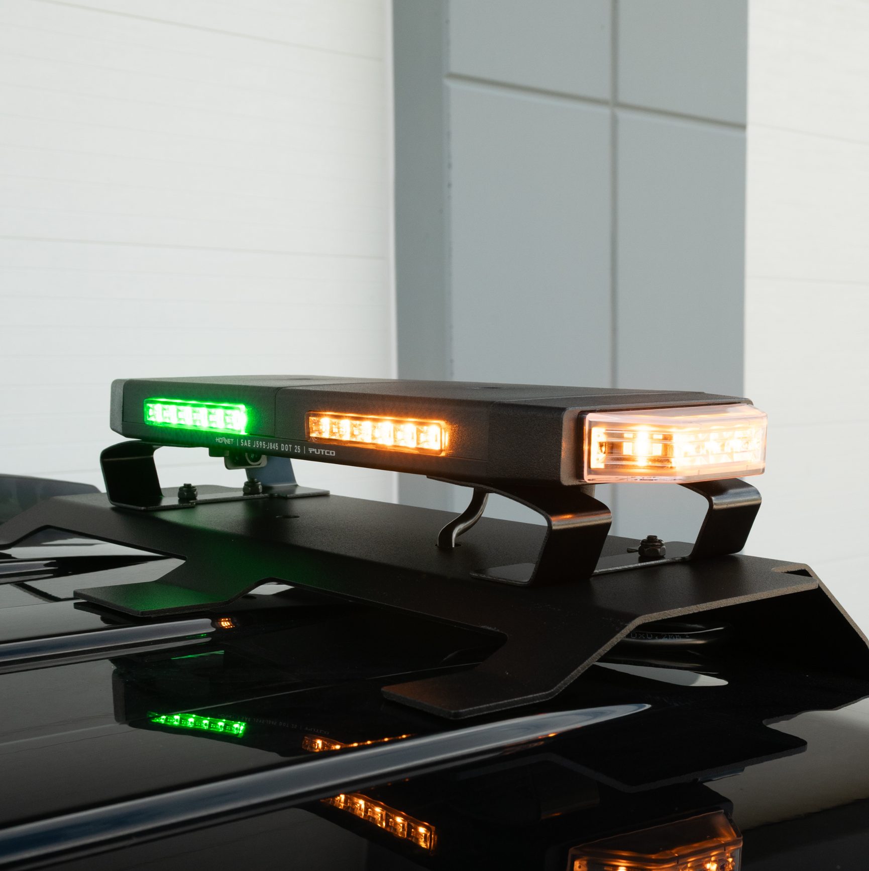 Its triple-color output sets the Green Hornet apart; choose from green, white, or amber strobe patterns, or configure a combination that suits your application. Whether you’re coordinating a construction zone, responding to roadside emergencies, or enhancing visibility for snow removal, the Green Hornet offers high-impact signaling in any environment. These roof top or headache rack strobe lights are great for security vehicles, contractors, emergency vehicles and more.