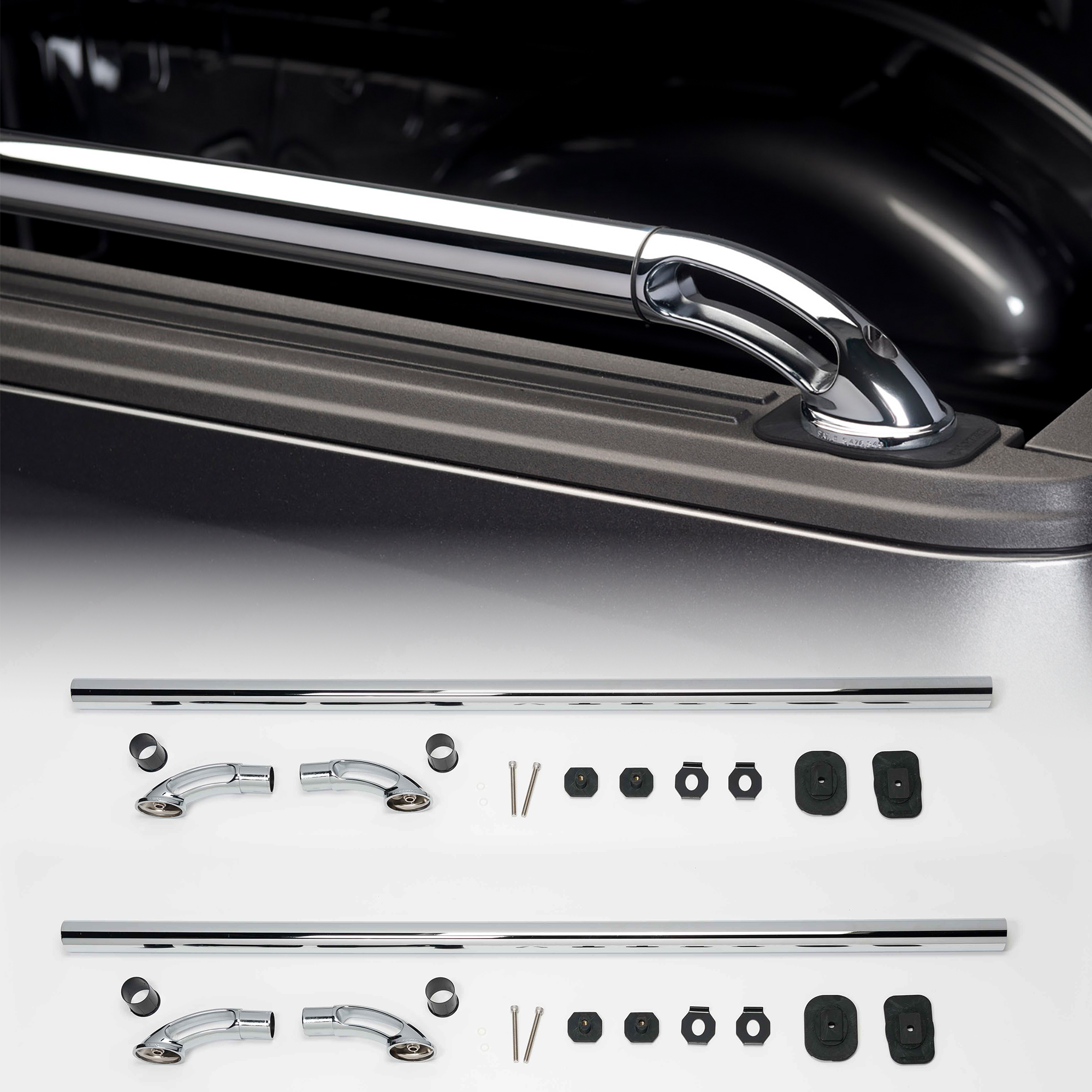 Designed for durability and a refined aesthetic, these rails are composed of premium stainless steel to resist rust and corrosion while maintaining a mirror-like finish. The custom-fit installation ensures a seamless appearance, while the robust construction provides additional tie-down points for secure cargo handling.
