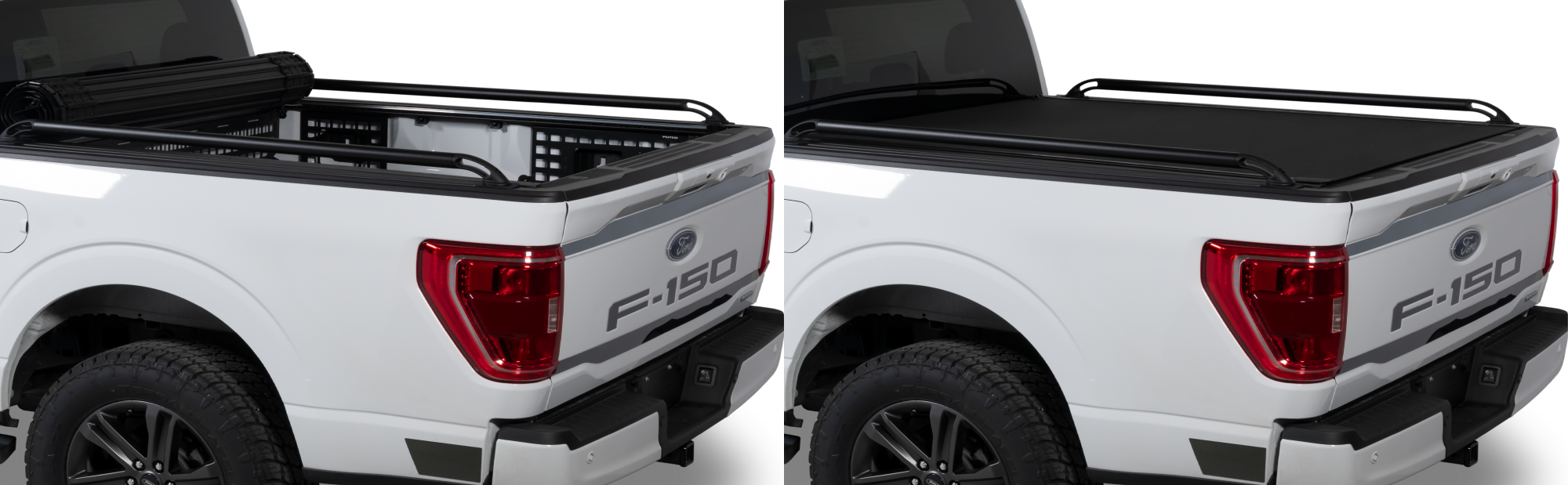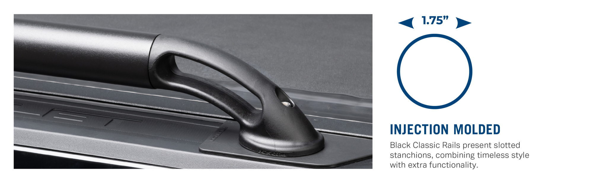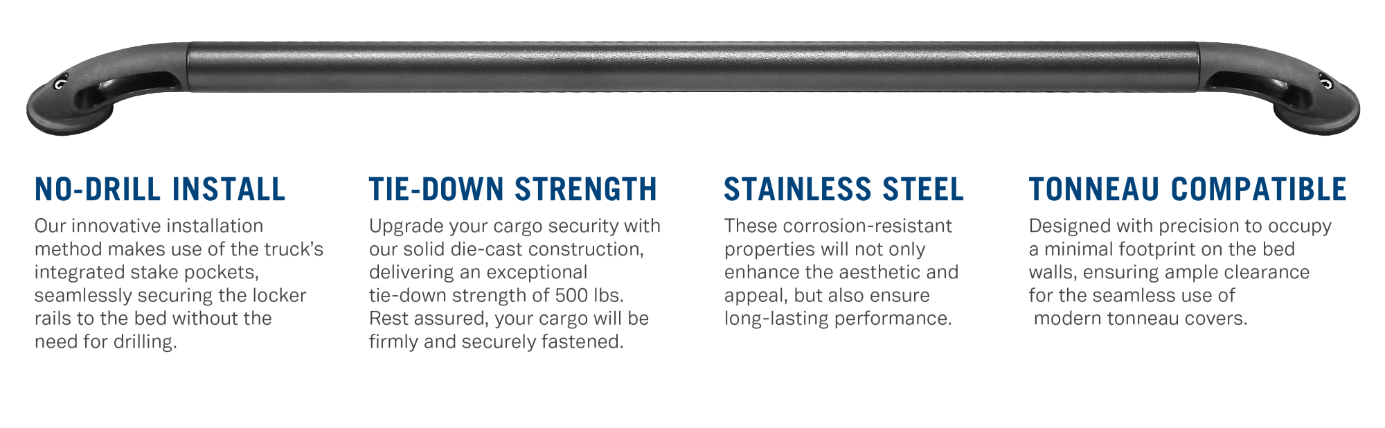 • Tie-Down Equipped Stanchions: Each tube mounts to a pair of end stanchions, which in turn mount to the vehicle. All four end stanchions are equipped with a built-in tie-down for additional functionality atop the truck bed.
