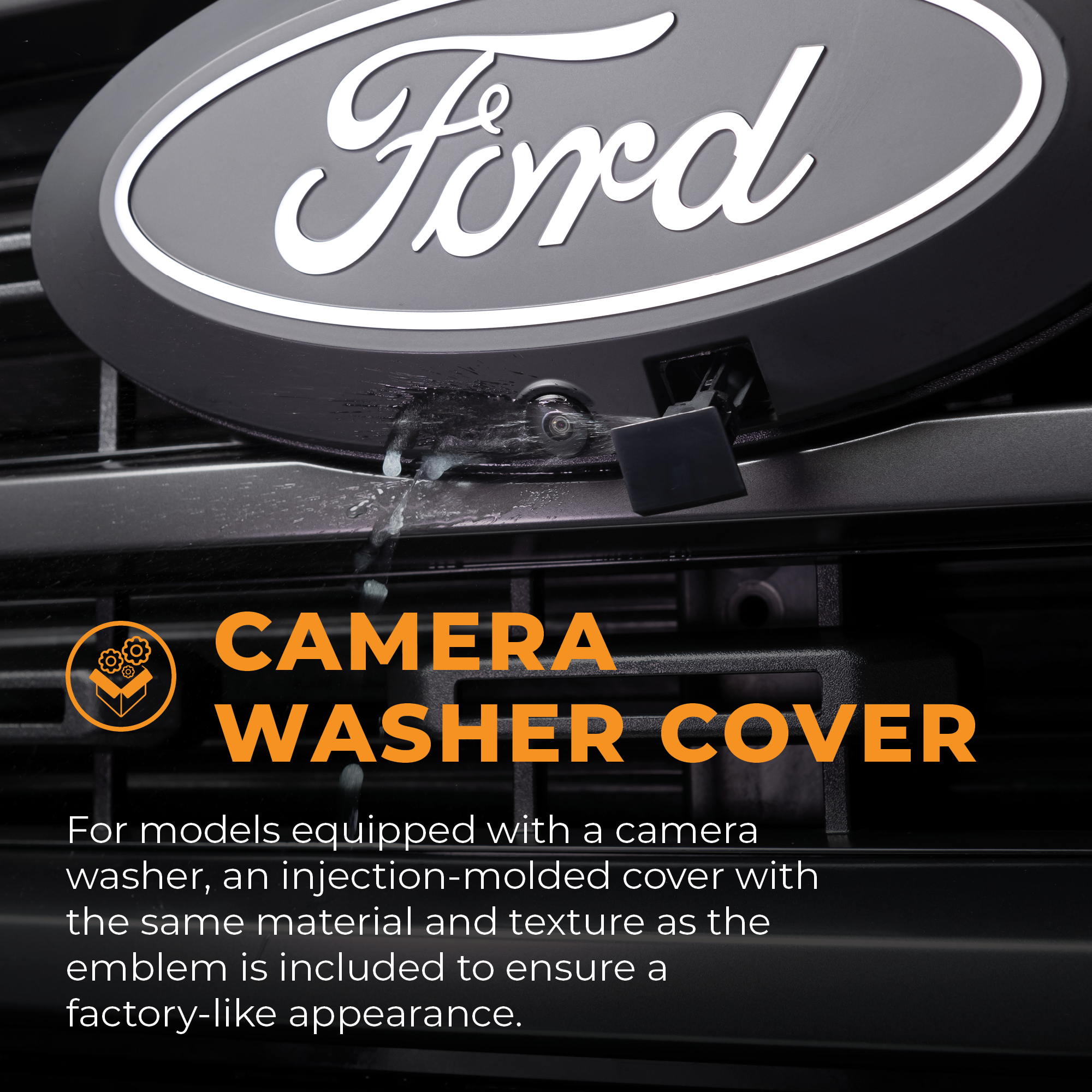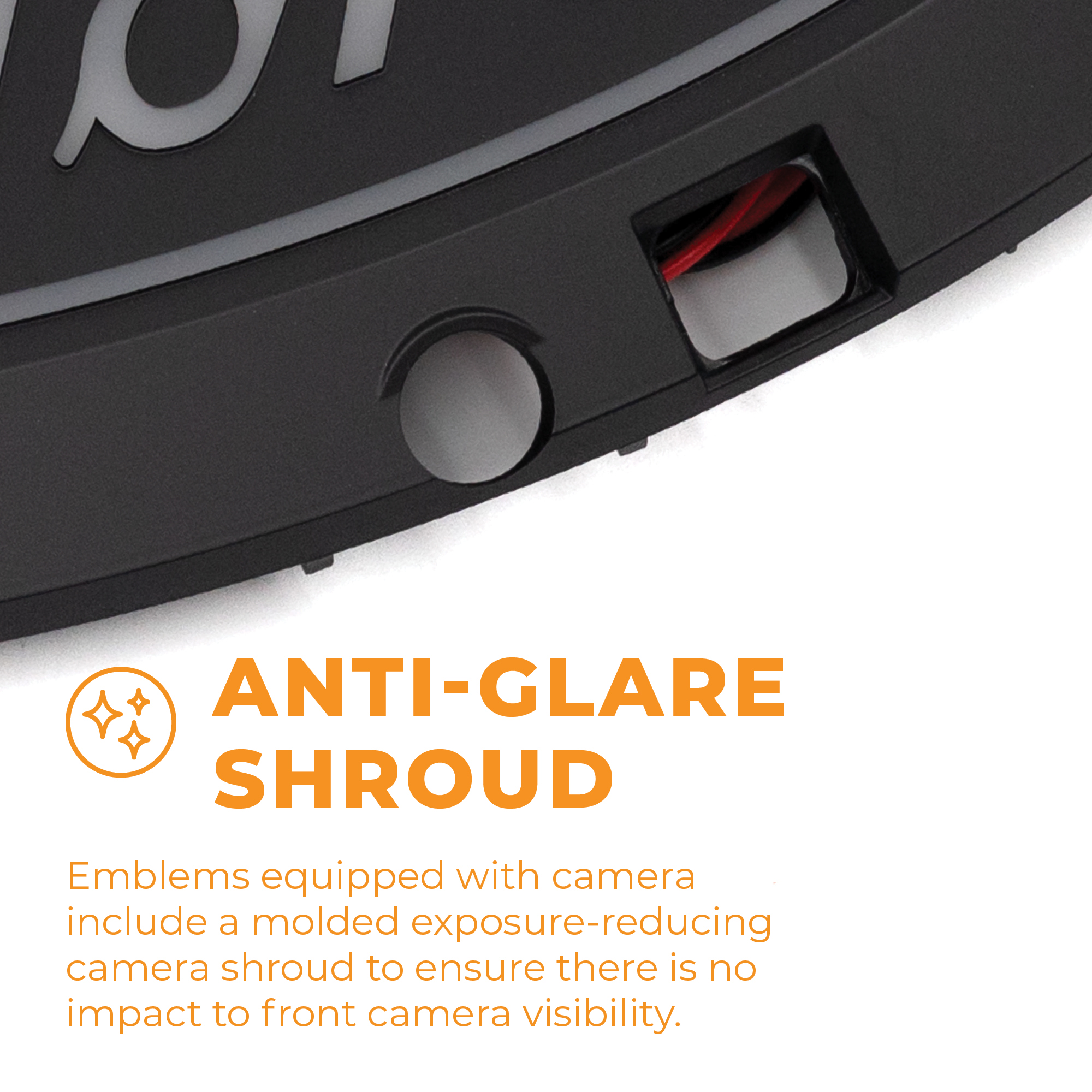 - Camera Compatible: Models available for emblems with or without front cameras and camera washers. For models with front camera, an exposure-reducing camera shroud is molded in the emblem to ensure there is no impact to front camera visibility. For models equipped with a camera washer, an injection-molded cover with the same material and texture as the emblem is included to ensure a factory-like appearance.