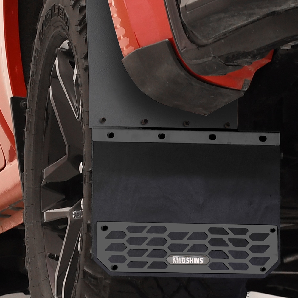 Give your truck ultimate protection from debris with our custom-style, no-drill mud skins. Our Putco solid-color mud skins are ideal for protecting your vehicle from rocks, mud, snow, and nearly anything else. Our Mud Skins are constructed from 18-gauge stainless steel coated with high-density black polyethylene, super-thick rubber, and a hex-weighted plate for a unique look. They are sold as a pair for either your front wheels, rear wheels, or all four. The solid shield carbon black mud skin offset design is ideal for those with oversized tires, providing extra clearance. Installing the solid shield splash guards is simple, with no drilling needed, and matching black finish hardware.